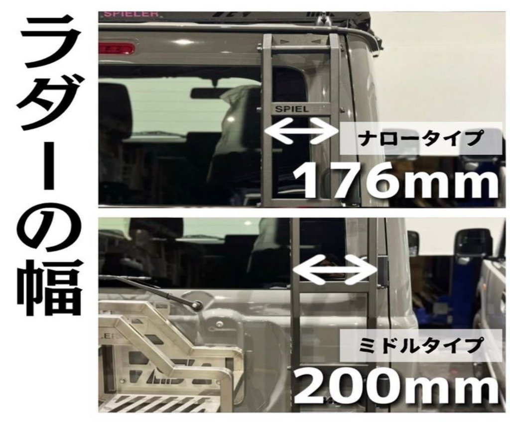 ラダーの幅はナローが176mm、ミドルが200mmとなっており、スペアタイヤは245/70R 16を取り付けても当たらない程度の外寸にしております。